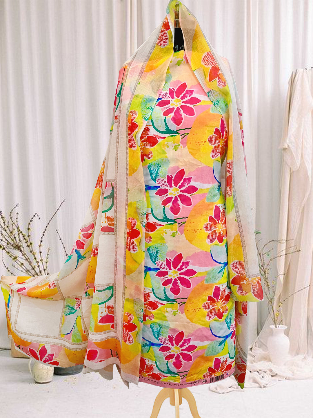 cotton yellow unstiched suit with printed soft dupatta & bottom