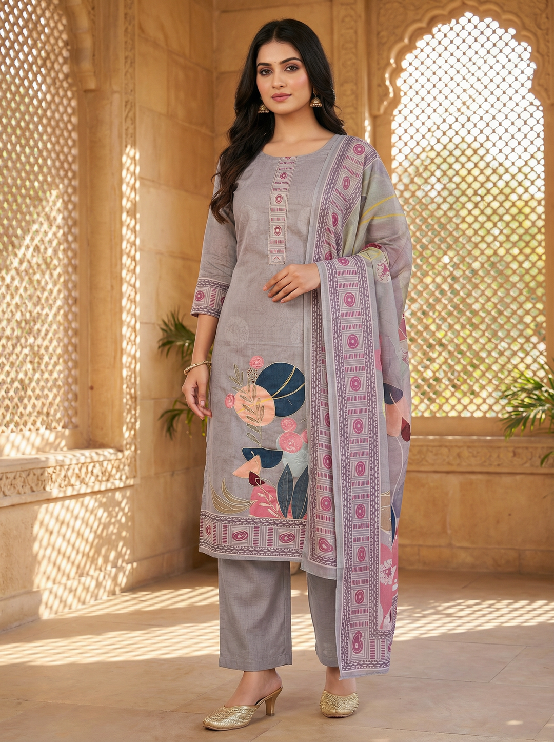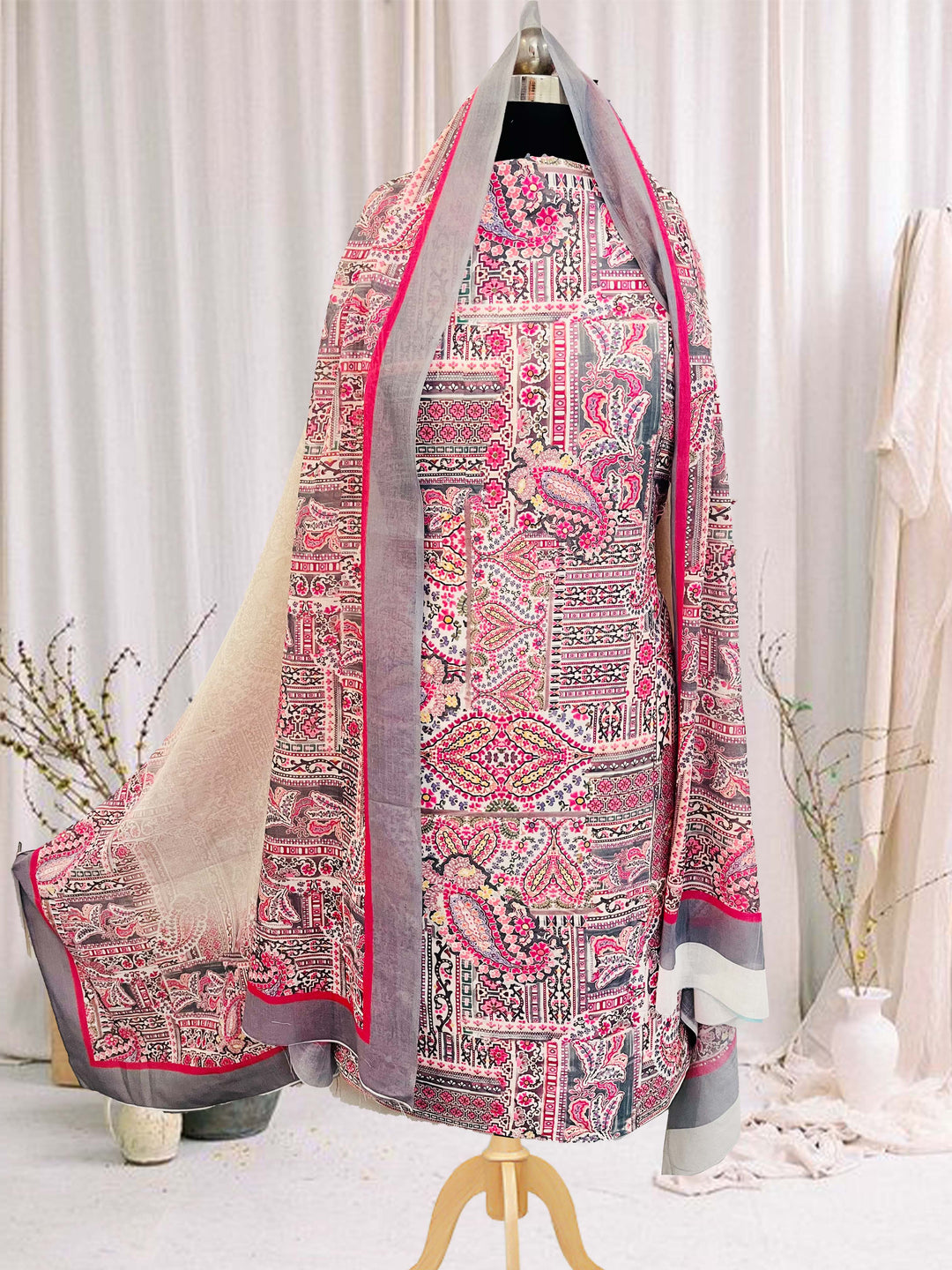 grey cotton unstiched suit with printed soft dupatta & bottom