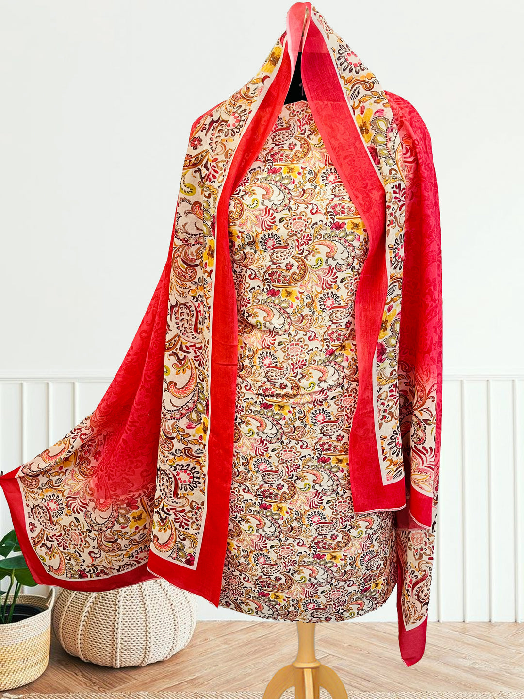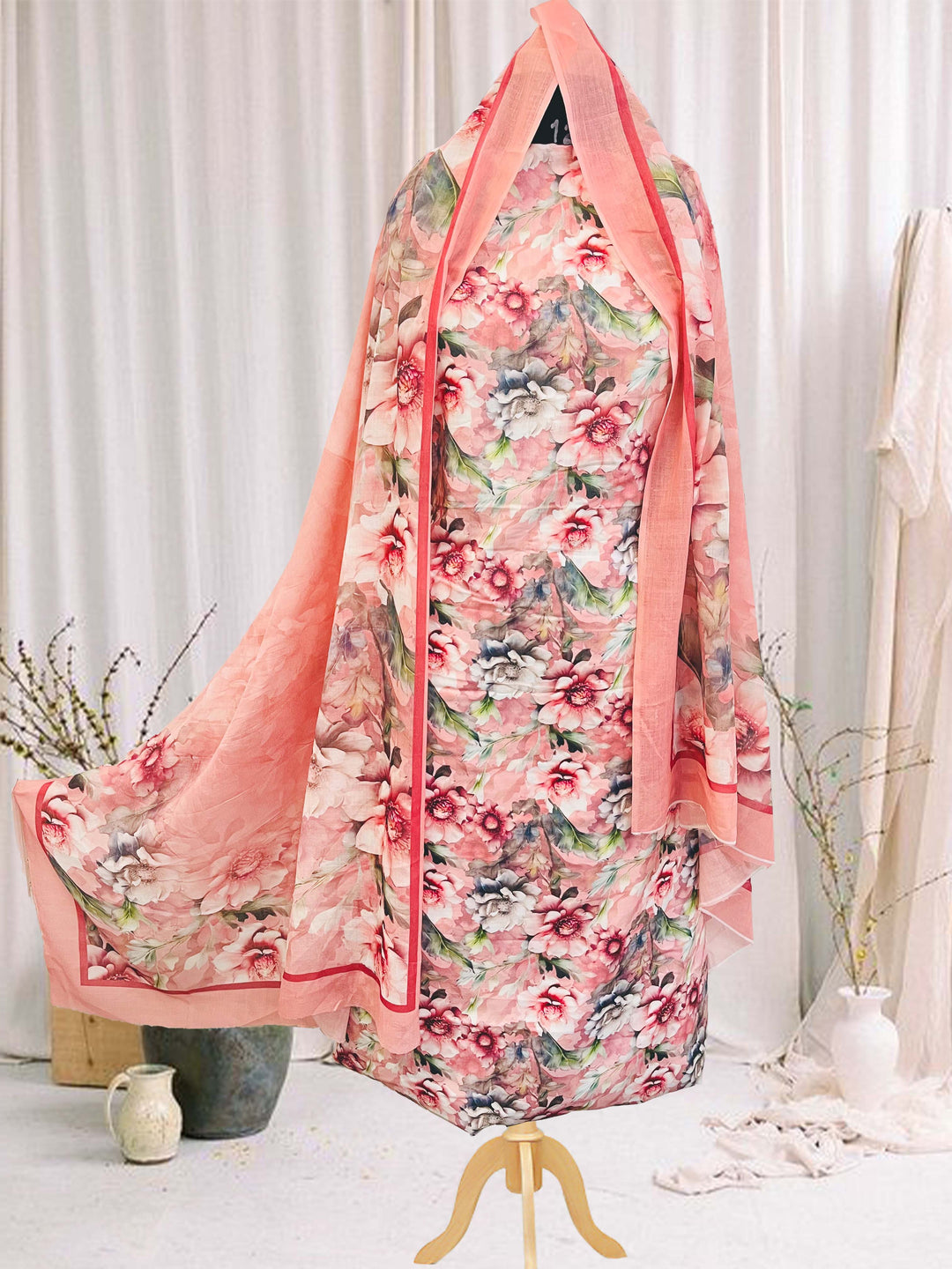 cotton peach florer unstiched suit with printed soft dupatta & bottom