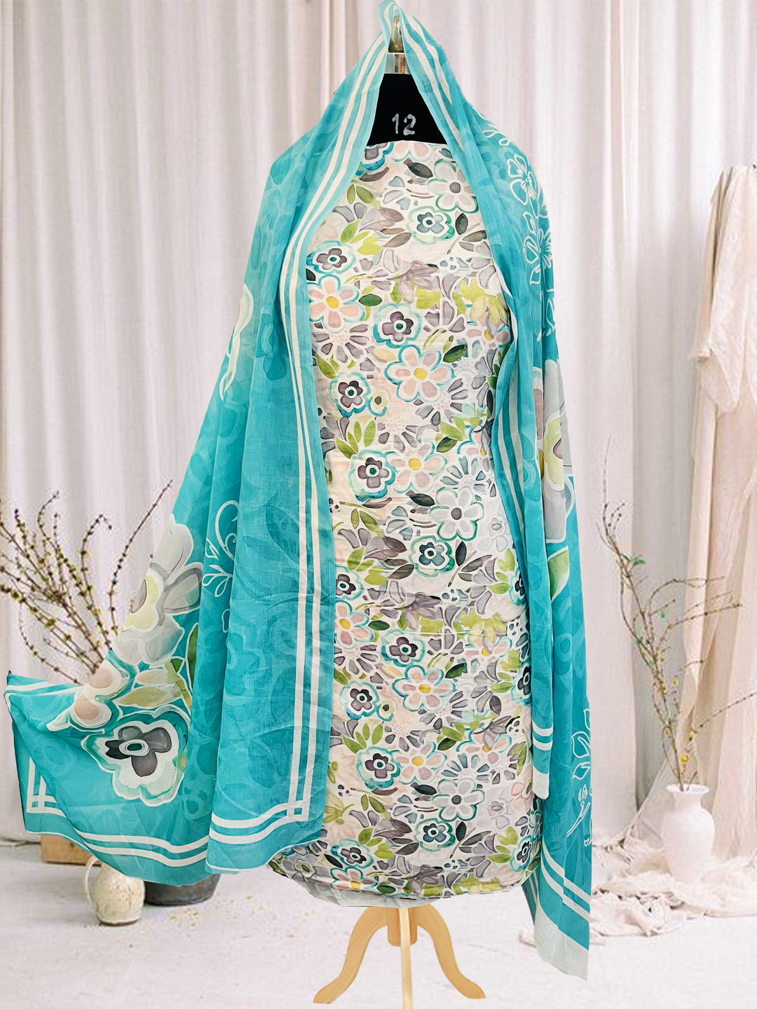 cotton blue florer unstiched suit with printed soft dupatta & bottom (Copy)